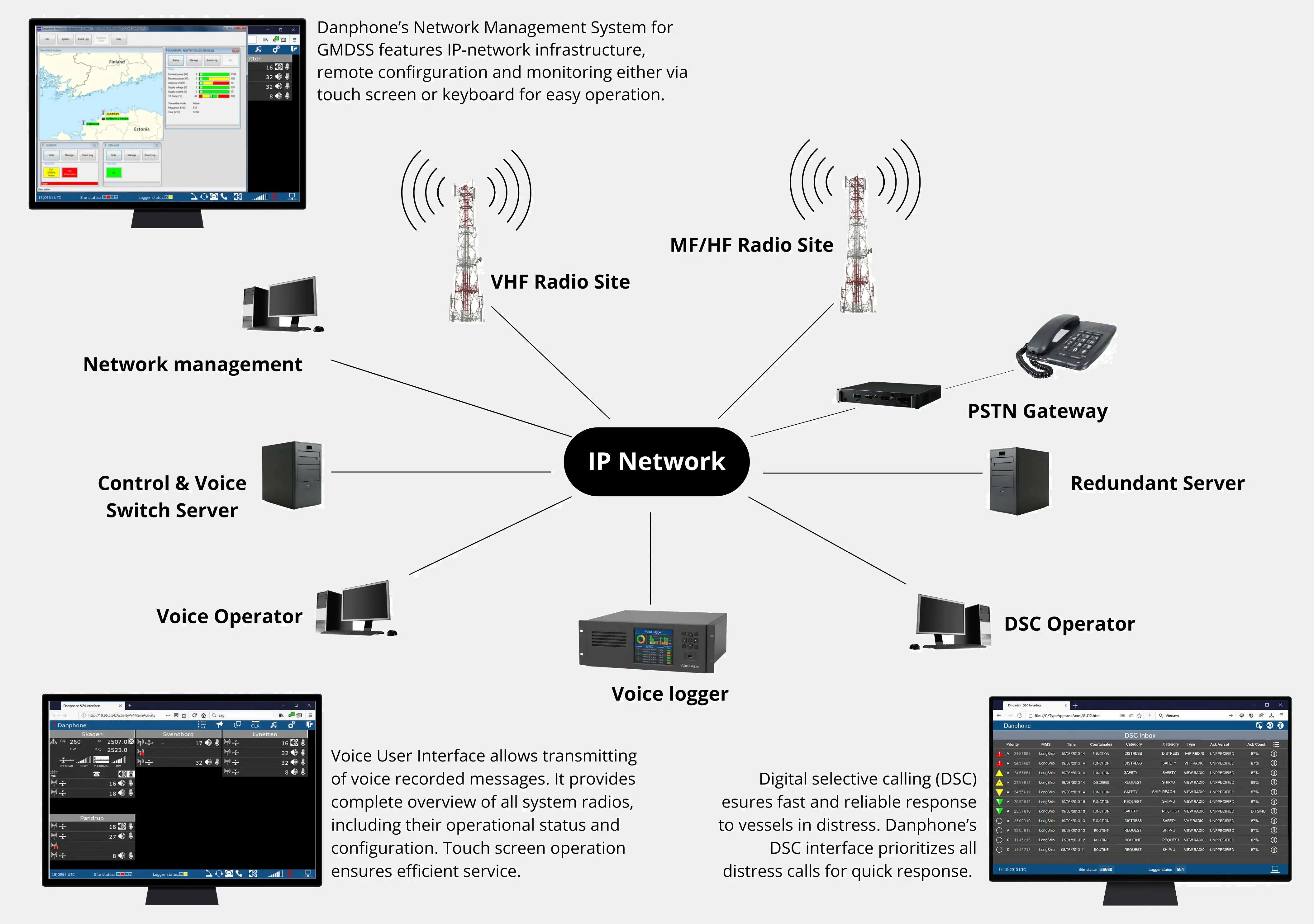 Danphone GMDSS coast stations for VHF and MF/HF are delivered in compliance with relevant IMO and ITU specifications, including DSC, voice and data logging, and interface with landline telephones. The system features IP-network infrastructure, Voice over IP and remote control via touch monitors.
