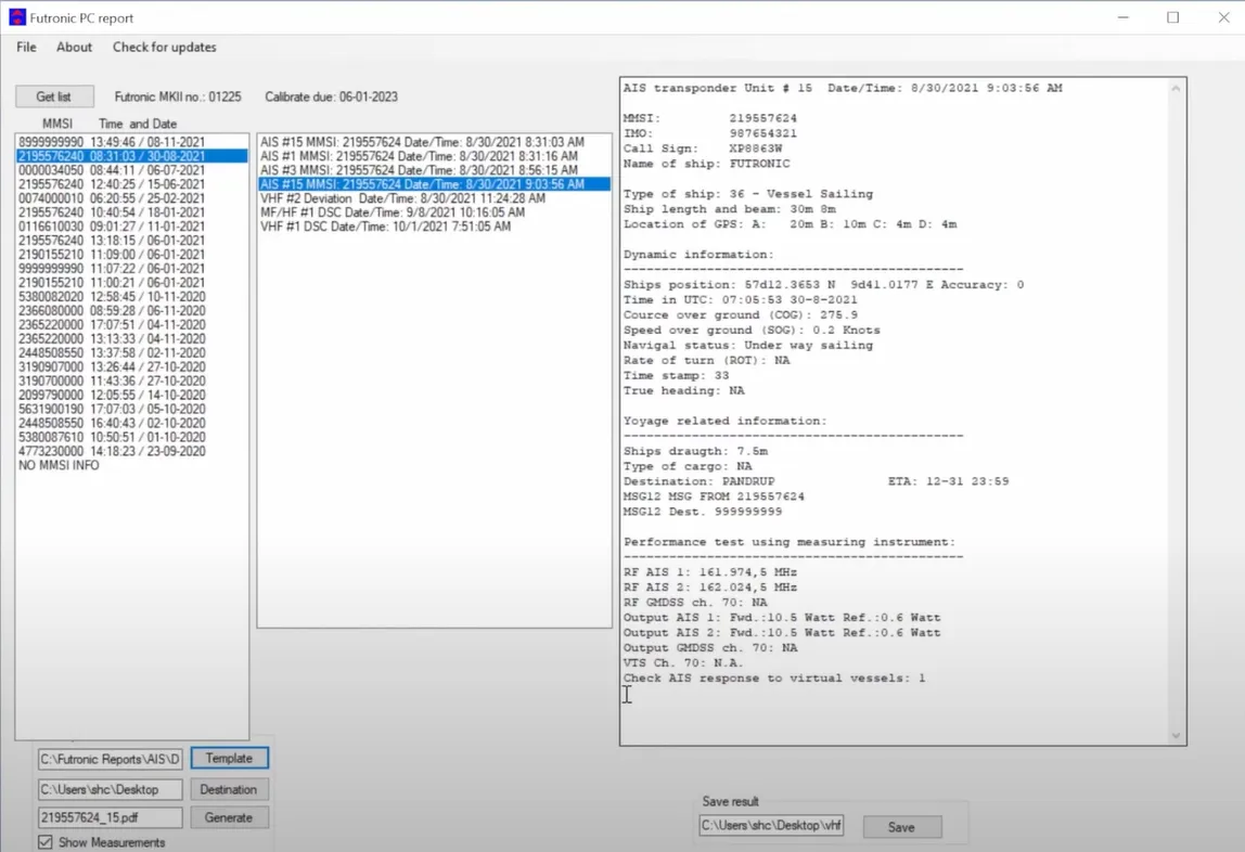 Futronic MKII provides a complete set of test results aligned with the survey reports for faster reporting. EPIRB and AIS reports are generated automatically by the PC software. Ready for sign-off. The PC software is always updated in relation to the latest IMO requirements and is always available to download here.